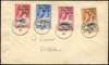 1961 (12 Oct) 'Tristan Relief' set of 4 to 10c + 1s, type 49 surcharges on Tristan da Cunha, tied to cover locally addressed to 'G. Lunn, St. Helena', by individual very fine strikes of 'OC 12 61' cds on first day of issue. Two vertical cover folds (not affecting stamps) but most attractive and rare. Only 434 sets were sold. Clear BPA cert (2015).