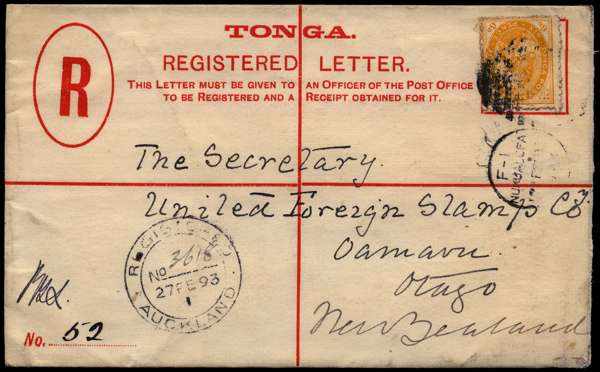 1893 4d. envelope, size G, registered letter addressed to Otago New Zealand, uprated with 1892 6d. yellow-orange cancelled by F-I Nukualofa '12 FE 93' duplex, alongside Auckland '27 FE 93' transit, a clean and attractive cover, H&G 4 Ex Baxendale