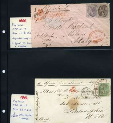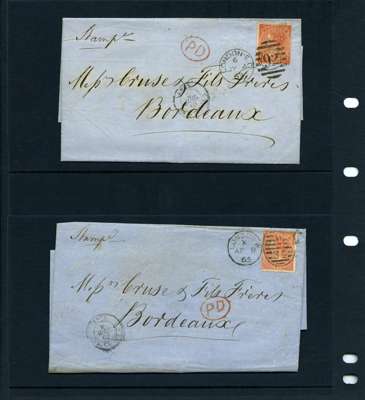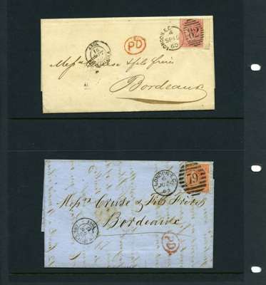 OVERSEAS MAIL: 1860-72 selection of six covers comprising 1860 to Italy registered franked with pair of 6d, 1861 to USA franked 1s, 1862 to Canada franked 6d, 1867 to France franked 4d, plate 8, 1868 to Saxony franked 6d hyphenated, plate 6 and 1872 franked 1d, plate 143, and 4d, plate 12, with 'L1' at lower left. Good to fine. An attractive group. (6)