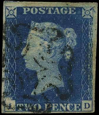 Plate 2 (JD) four close to large margins cancelled by black MC, lightly scuffed on the "J" otherwise fine