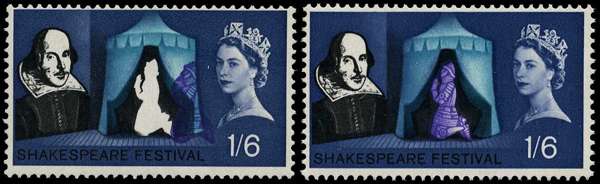 1964 1s6d Shakespeare Festival ordinary, approximately 5mm shift of violet to right causing Henry V to appear white, a most striking variety offered with normal for comparison,. large part o.g. SG 649var