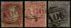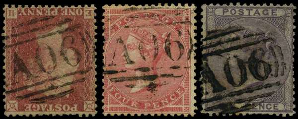 GB USED ABROAD: Trio of values cancelled with “A06” numeral, 1857 1d red (re-perfed at base), 1857 4d (missing perf at left), 1865 6d (repaired). Nevertheless, collectable examples of these scarce usages (3)