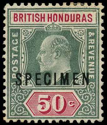 1907 50ct grey-green and carmine, watermark MCA, overprinted SPECIMEN Type D12. O.g. example with some hinge remainder, R1/3 LP damaged frame and crown (Spaven flaw); rare, with the variety unlisted on the basic stamp. SG 90s var.