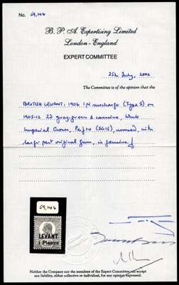 1906 '1 Piastre' on 2d grey-green and carmine, surcharge type 5, Beyrout provisional, large part o.g; minor gum wrinkles, still well above average for this key stamp with only 480 issued most of which were used, very fine. BPA Certificate (2002), SG 15