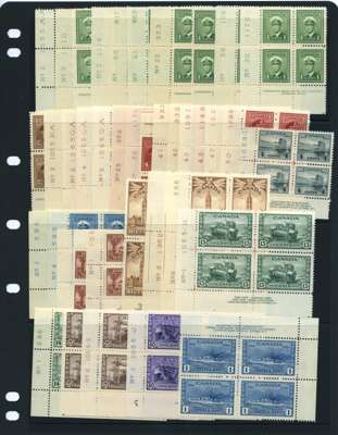 1942-8 War Effort Plate blocks, o.g., the great majority unmounted but the occasional block (including the $1) hinged on the selvedge. 1ct (10), 2ct (2), 3ct (11), 4ct slate, 5ct (2), 8ct (4), 10ct (3), 13ct, 14ct, 20ct (2), 50ct and $1. All different numbers or corners. SG 375-388, £1007