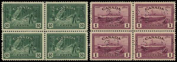 Official. 1946 Peace 50ct and $1 punctured OHMS, unmounted o.g. blocks of four. SG O157-8, £540
