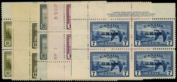 Officials. 1949 10ct to $1 plus 7ct Air, unmounted o.g. Plate blocks of four. Very fine. SG O166-171, £968