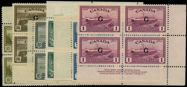 Officials. 1950 'G' overprints on 10ct - $1 and 7ct Air, unmounted o.g. blocks of four. Fine except one 20ct with a small grease mark. The 10ct, 14ct and $1 are Plate blocks. SG O185-190, £670