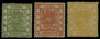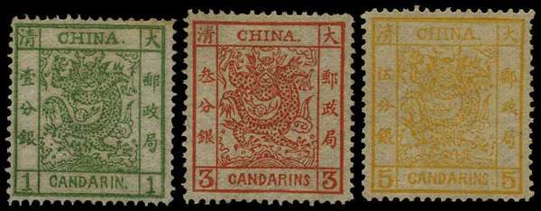 1878 Large Dragon thin paper set of three, 1ca green, 3ca vermilion and 5ca orange, large part o.g; couple of toned perfs to top of 1ca, nonetheless a fine set with fresh colours. SG 1-3, Chan 1-3