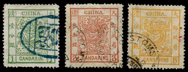 1882 1ca green, 3ca brown-red and 5ca yellow-ochre, 4½mm spacing on thin or pelure paper, 1ca used by large part Chefoo seal in blue, others by part Customs cds in black, odd small imperfections but well above average for this issue (cat £3700)