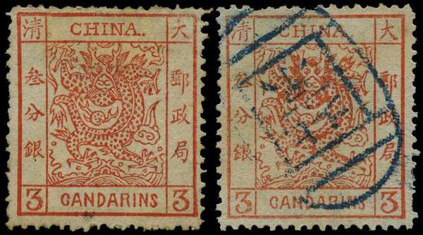 1883 Large Dragon thick paper, 3ca vermilion, unused (no gum) and used example cancelled by Peking seal, a collectable pairing. SG 8; Chan 8a