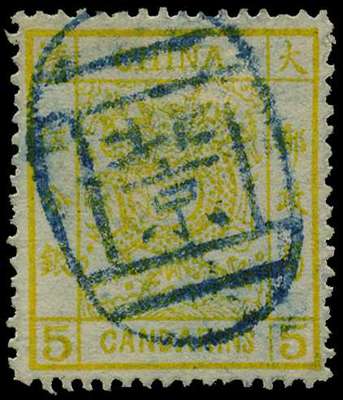 1883 Large Dragon thick paper, 5ca chrome-yellow, used bearing Peking seal in blue, fine. SG 9; Chan 9