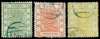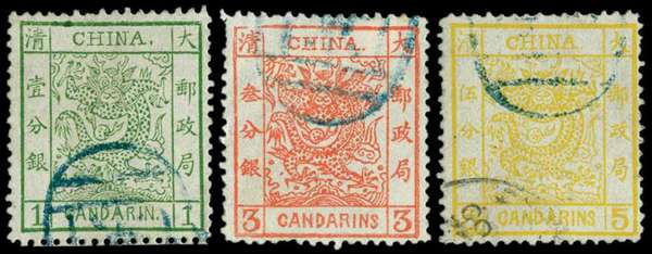 1883 thicker paper, 2½mm spacing, clean-cut perf 1ca green, 3ca vermilion and 5ca chrome-yellow, each fine used by part Peking seal in blue, 5ca also with part arrival cds