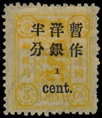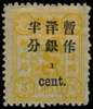 1897 ½c on 3ca orange-yellow, surcharged spaced 3mm, variety 'FRACTION BAR and 2 of ½ OMITTED'; large part og (paper hinge remainder); one shortish perf. Fine colour. SG 37e, Chan 37i