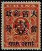 1897 Red Revenue One cent on 3c deep red, larger figures surcharge type 18, brilliant large part o.g. fine, SG 88, Chan 87