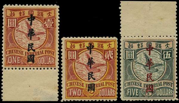 1912 London overprint $1 to $5, mint trio with top value marginal unmounted. Very fresh colours. SG 230/32, Chan 181/83