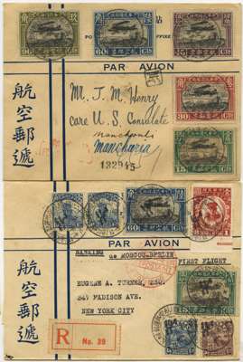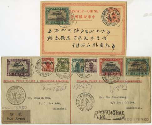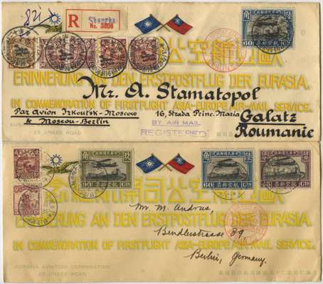 POSTAL HISTORY: 1931 Eurasia Aviation Corp. first flight covers Shanghai via Moscow to Europe. Interesting selection includes registered onward to New York, registered to US Consulate Manchouli Manchuria, to Berlin, registered via Berlin to Romania, registered to and from Manchouli. Various franking etc. (6)