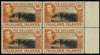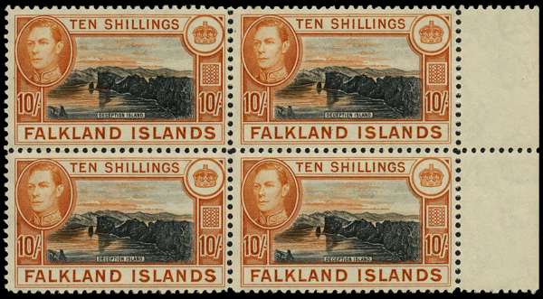 1939 10/- black and light orange right-marginal block of four, showing the characteristic rippled gum, unmounted o.g. Facially a lovely block and very scarce, but unfortunately two of the stamps have small foxed areas on the reverse. SG 162a, £1400