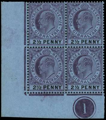 1907 2½d purple and black on blue paper, unmounted o.g. lower left corner block of four from the left pane, R10/1 large '2'. slight ink smearing, as often on this chalk-surfaced paper, still a fine positional piece. SG 59, a, £764