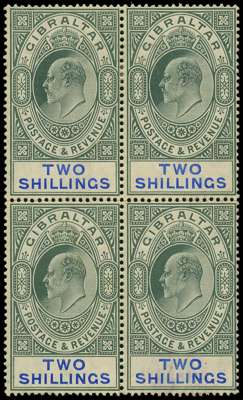 1907 2/- green and blue on chalk-surfaced paper, watermark MCA, large part o.g. block of four. Scarce multiple. SG 62a, £480