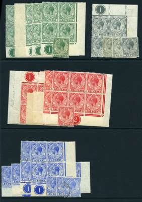 1912-24 watermark MCA duplicated mint group to 1/-, with blocks, plus 2/- and 4/-. Includes Plate blocks; ½d x 5, 1d x 4, 2d, 2½d x 2, 6d x 4 and 1/- two different. Good range, with some unmounted, a few faults noted and viewing advised. SG 76-83