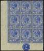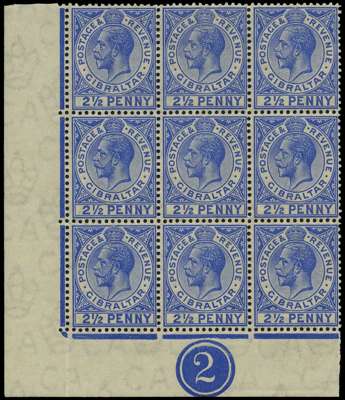 1912-24 2½d deep bright blue Plate 2 block of nine from lower left corner of sheet, R10/1 large '2'. Large part o.g. and fresh, hinged on top row only. Some very faint offsetting on reverse. SG 79, a, £380