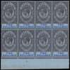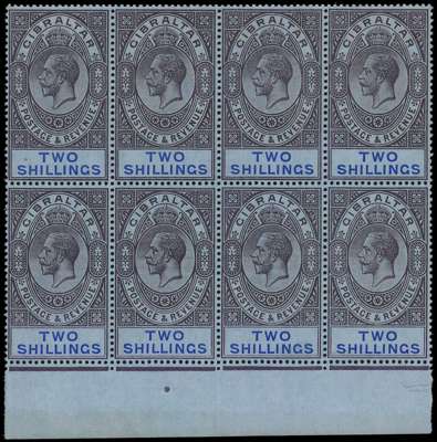 1912-24 2/- dull purple and blue on blue paper bottom marginal block of eight, lightly hinged on the selvedge only, the stamps unmounted o.g. Central vertical fold. SG 82, £240