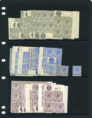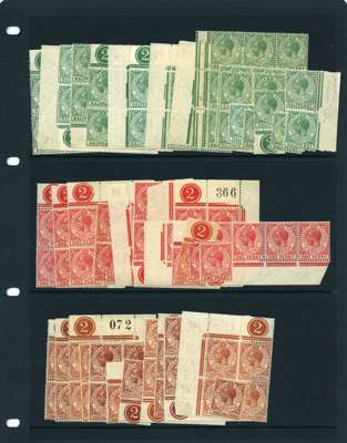 1921-7 mint accumulation on three Hagner sheets, singles and Plate blocks in the main. Plate blocks; ½d x 9, 1d x 7, 1½d x 7, 2d x 8, 3d x 7, 6d x 7, 1/- x 4 and 2/- x 2. Various shades and printings. Also 4/- unmounted o.g. and 1930 3d Plate block. SG 89-100
