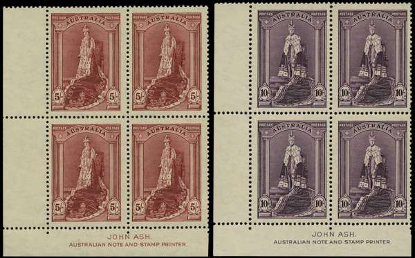 1938 5/-, 10/- and £1 Robes thick papers, unmounted o.g. Ash imprint blocks of four, very fine. SG 176-8, £592