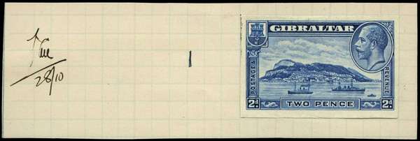 1931-33 "Rock" 2d deep blue colour trial on watermarked paper, affixed to piece initialled and dated 28/10, apparently prepared at request of Colonial Secretary who wanted this value to be as bright as possible for propaganda purposes, believed to be unique. Ex Kayfetz (14/5/1997, lot 739), SG 112var