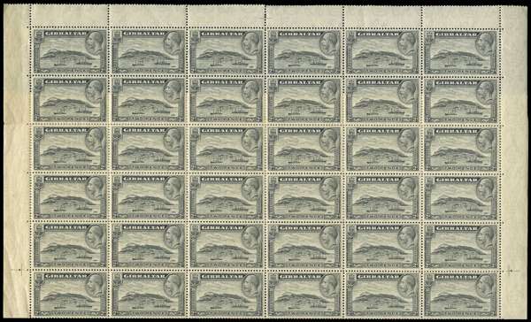 1932 Rock 2d pale grey, perf 13½ x 14, lower pane of sixty with Plate 1 at base, unmounted o.g. Folds, some splitting between left selvedge and stamps; displaying some gum creasing and cracking (mainly on selvedge), but not at all in bad condition and an unusual survivor. SG 112, £1440