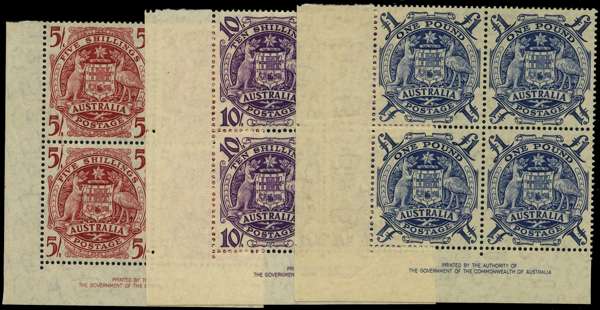 1949-50 Arms 5/- to £1 set of four in By Authority imprint blocks of four, o.g., the 10/- and £1 each with one stamp hinged; the £2 unmounted with R4-5/1 roller flaws. SG 224a-da, £490