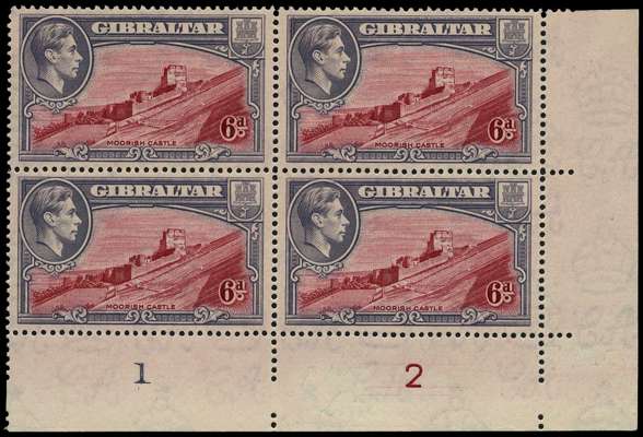 1938 6d perf 14 lower right corner block of four with Plate 1-2, fresh unmounted o.g., very well centred. Scarce. SG 126a, £480