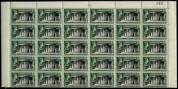 1938 1/- black and green, perf 13½. Upper half-sheet of thirty with sheet number 015, fine o.g., hinged on three stamps only. An extraordinary multiple of a stamp which is seldom seen even in a block of four. SG 127a, £2250