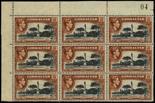 1938 2/- black and brown perf 14, top left corner block of nine showing sheet #04 above R1/3, o.g. Rather enthusiastically hinged on the top selvedge and the lower row, but with six stamps unmounted and a very unusual multiple. SG 128, £675
