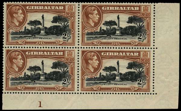 1938 2/- black and brown perf 13½, lower right corner block of four with FP1. Rather heavy natural gum bends affect the lower pair, but a rare block. SG 128a, £520