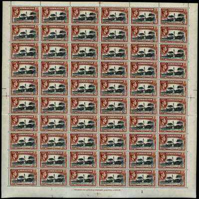 1942-51 2/- perf 13 complete sheet of sixty (folded), unmounted o.g. An early printing (probably 1942) with the frame in a chestnut shade, prior to re-entering or the R9/3 flaw, showing doubled vignette Plate 1 under R10/2 and FP 1 below R10/5. A rare multiple. SG 128b, £720