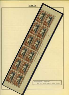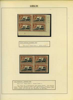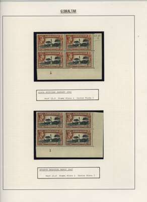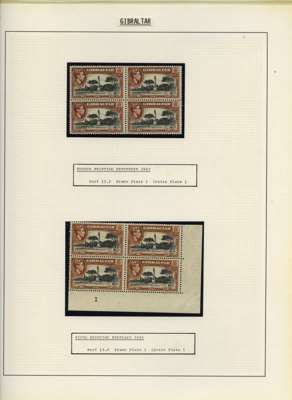 1942-51 2/- black and brown perf 13 printings, mint blocks of four or larger written up on leaves. March 42 bottom two rows, central vertical fold, unmounted o.g.; Sep. 43 mint, one with toned spot on reverse; Feb. 45 FP 1 unmounted; Jan. 46 FP 1, ex SG reference collection, unmounted; Mar. 47 FP 1 unmounted; Dec. 47 FP 1, ex SG reference collection, unmounted; (Oct. 48 offered separately); Jan. 49 unmounted; May 51 two unmounted blocks, one top left and the other showing FP 2. A very difficult reconstruction. SG 128b