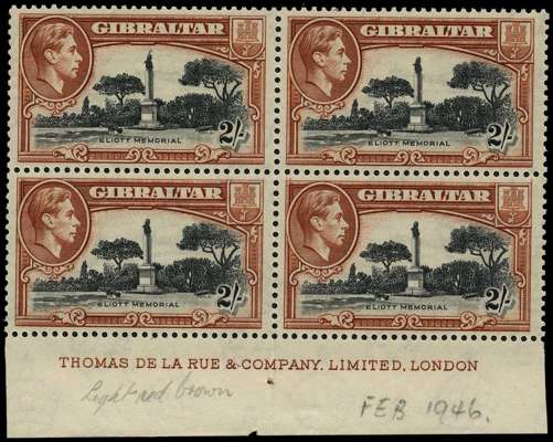 1946 printing of the 2/- in light red-brown, imprint block (light vertical fold) with R9/3 'bird on memorial'. The variety stamp very lightly hinged. SG 128bb, £850