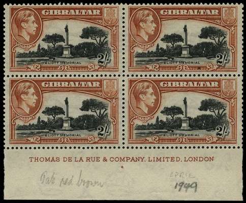 1949 printing of the 2/- in pale red-brown, imprint block with R9/3 'bird on memorial'. SG 128bb, £850