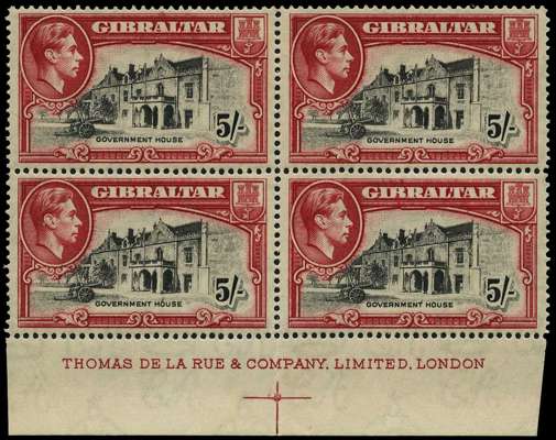 1938 5/- black and carmine perf 14, unmounted o.g. imprint block of four. Central vertical fold but very well centred for this stamp; a rare multiple. SG 129, £440