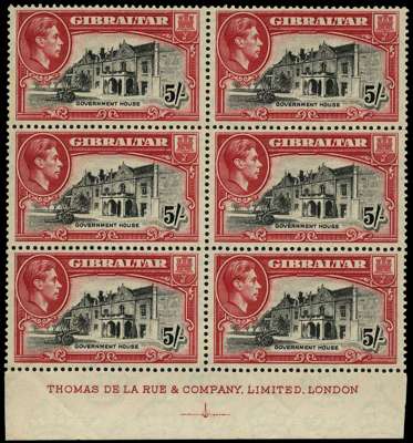1938 5/- black and carmine perf 13½, unmounted o.g. imprint block of six, natural gum bends affecting lower pair otherwise fine. SG 129a, £300