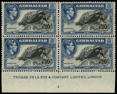 1951 printing of 10/- perf 13, unmounted o.g. imprint block of four with R9/3 broken 'R', well centred and immaculate. Very rare. SG 130ab, £8500