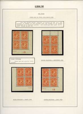 1938-51 £1 orange unmounted o.g. blocks of four of each of the four printings. 1938 1B plate block, 1941 and 1944 corner blocks and 1952 another 1B Plate block, a rarely-offered group. SG 131, £720