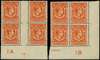 1938-51 £1 orange Plate 1A (interpanneau) and 1B blocks of four, o.g. 1A lightly hinged on gutter margin, just extending onto one stamp, 1B lower right corner, unmounted. SG 131, £360