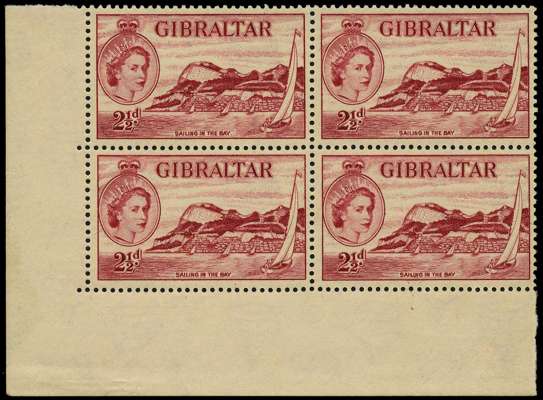 1953-9 2½d deep carmine lower left corner block of four, watermark inverted, unmounted o.g. Typical faintly yellowish gum for this variety, of which one sheet was discovered; the watermark visible in the margins from the face. A unique positional multiple, ex Kayfetz. SG 149aw, £3000