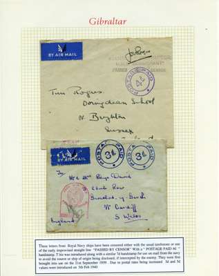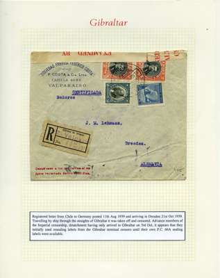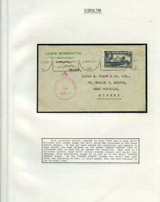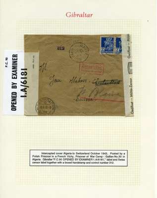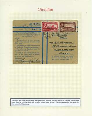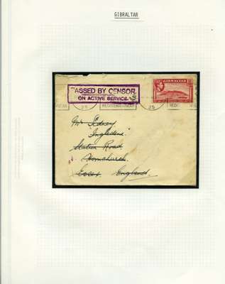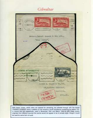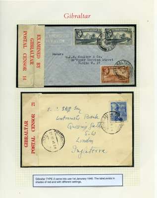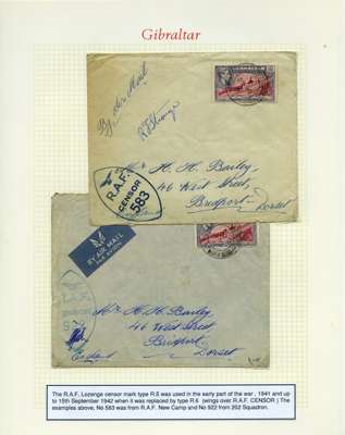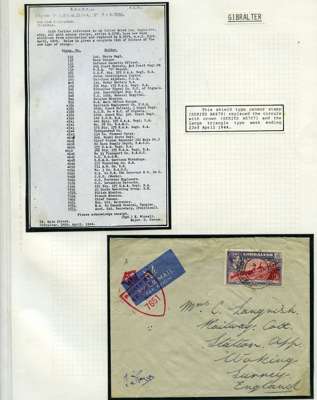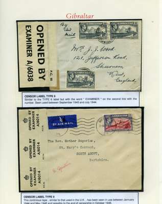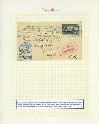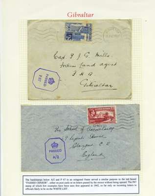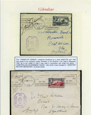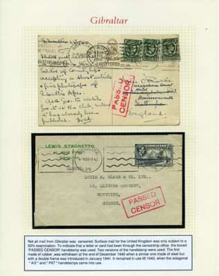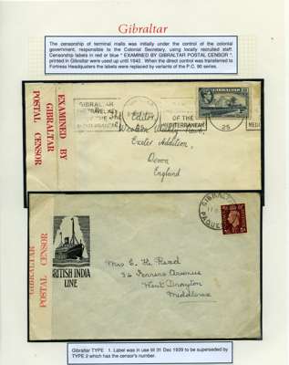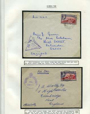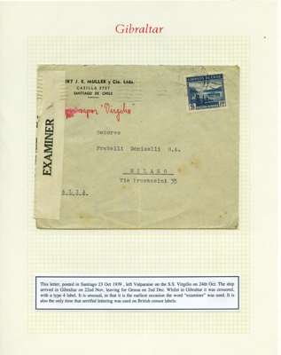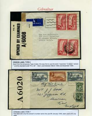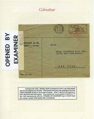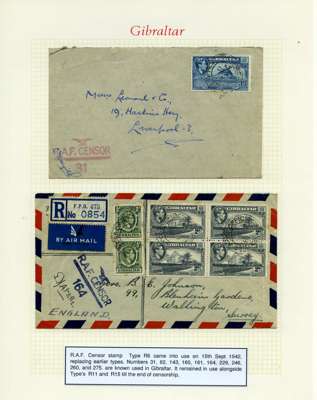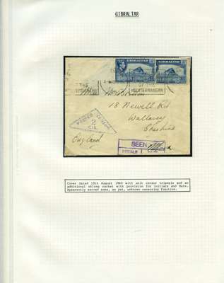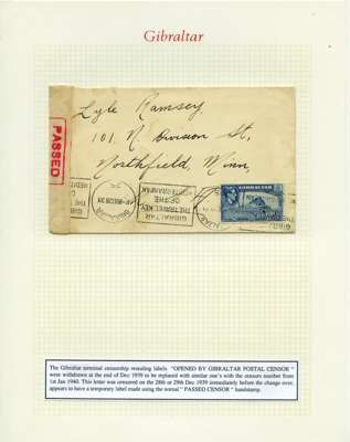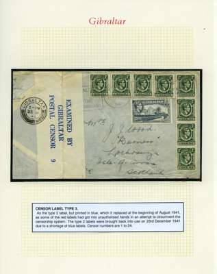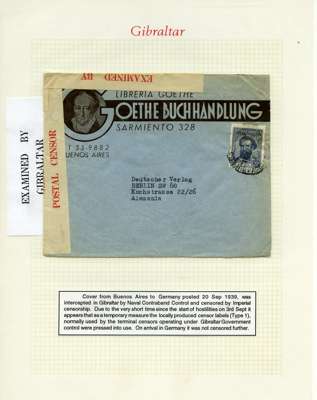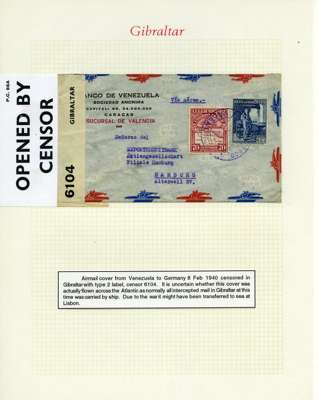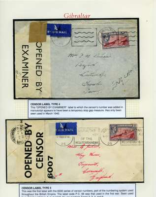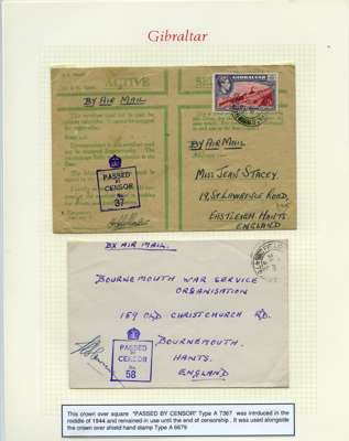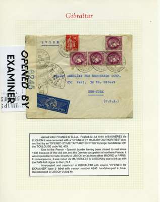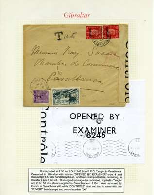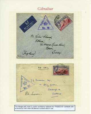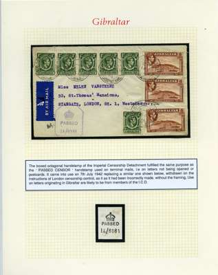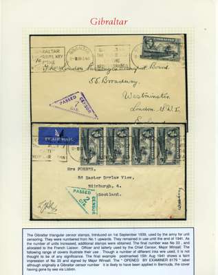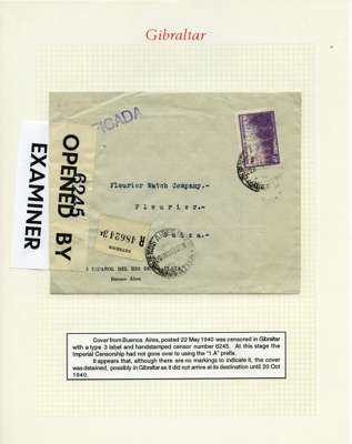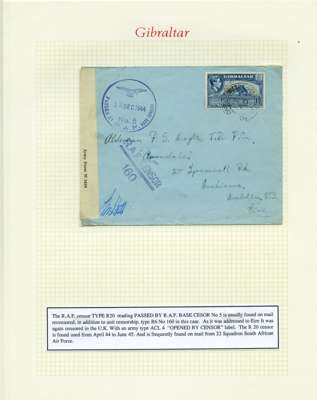 Postal History. Box containing written-up display of WW2 censorship, authoritative and most interesting. 84 covers plus 18 intercepted/transit mail, offered intact as received. We note red and blue POSTAL CENSOR labels, OPENED BY EXAMINER (Type 4), RAF several types and on intact S. Africa 1944 pictorial airletter, Naval envelopes, PASSED BY EXAMINER, RAF Active Service envelope, POSTAGE PAID circular handstamp group with covers bearing 3d x 2 (2), 4d and 5d x 2 (2), Ships mail (M.M. and H.M. Ships reg. labels), free Red 'X' air letters (4), APPROVED, brief exposition of the general handstamp types in selected quality, and the varied intercepted/transit mail group with origins including Argentina, Chile and Venezuela