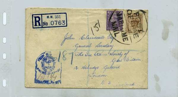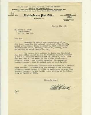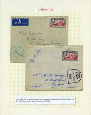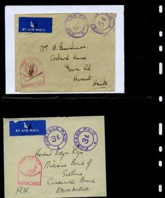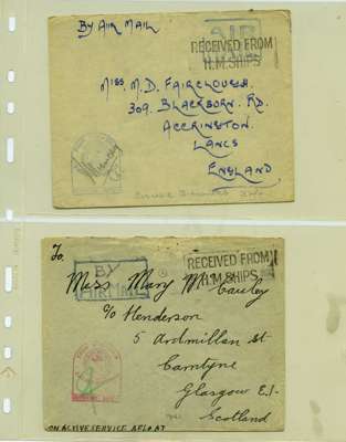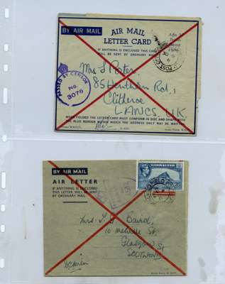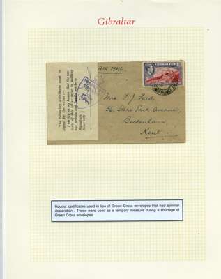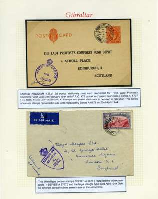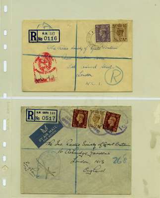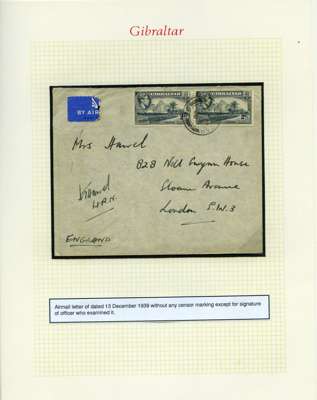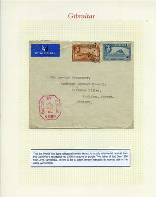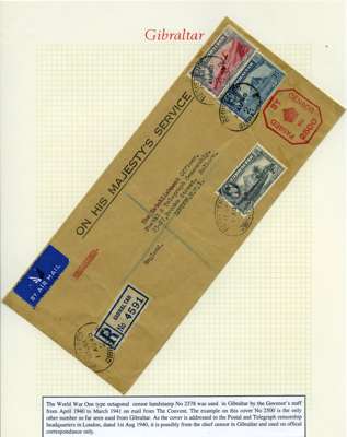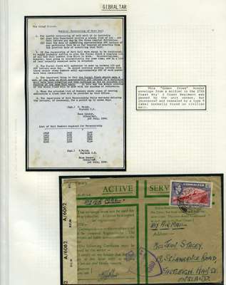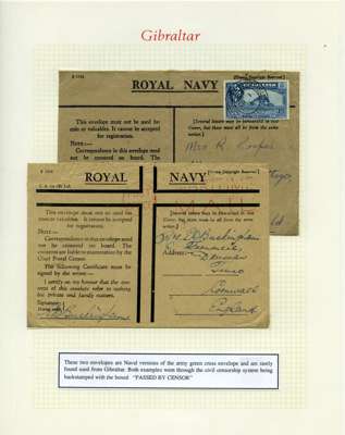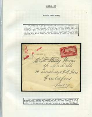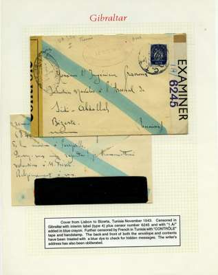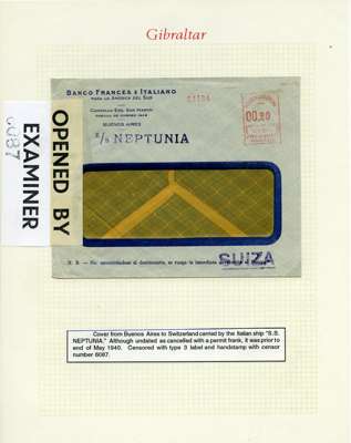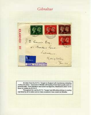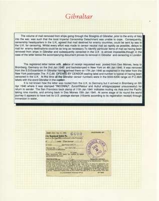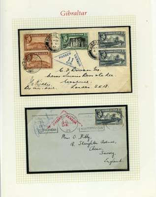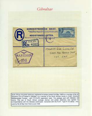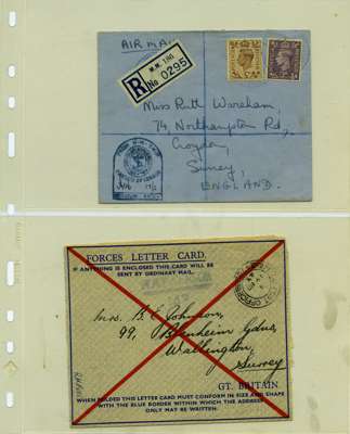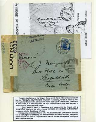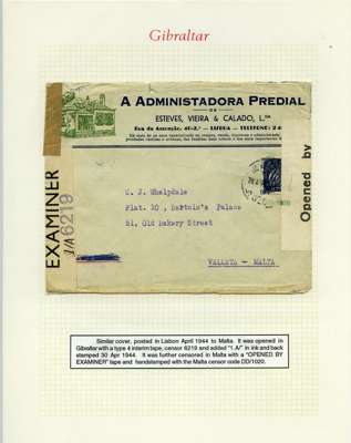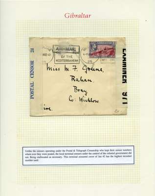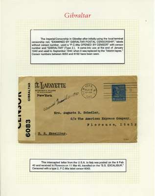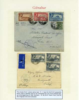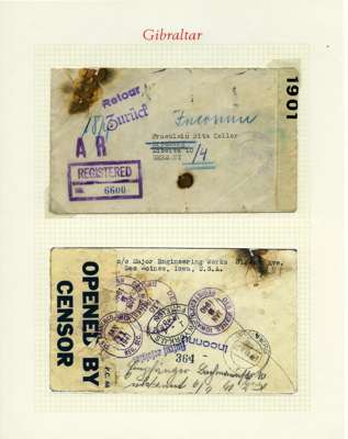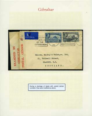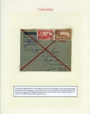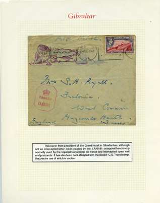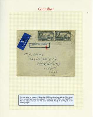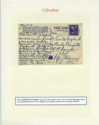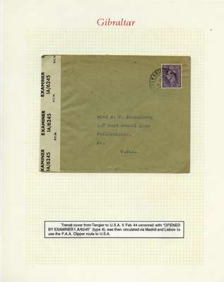 Postal History. Box containing written-up display of WW2 censorship, authoritative and most interesting. 84 covers plus 18 intercepted/transit mail, offered intact as received. We note red and blue POSTAL CENSOR labels, OPENED BY EXAMINER (Type 4), RAF several types and on intact S. Africa 1944 pictorial airletter, Naval envelopes, PASSED BY EXAMINER, RAF Active Service envelope, POSTAGE PAID circular handstamp group with covers bearing 3d x 2 (2), 4d and 5d x 2 (2), Ships mail (M.M. and H.M. Ships reg. labels), free Red 'X' air letters (4), APPROVED, brief exposition of the general handstamp types in selected quality, and the varied intercepted/transit mail group with origins including Argentina, Chile and Venezuela