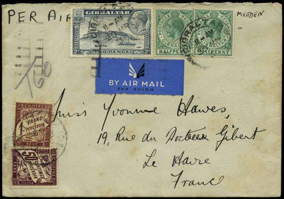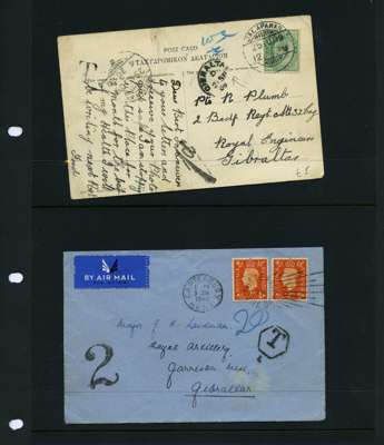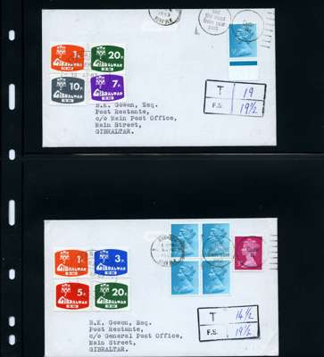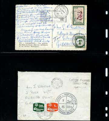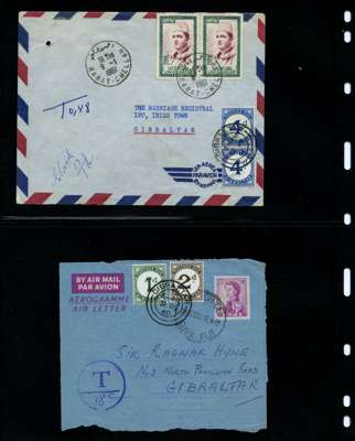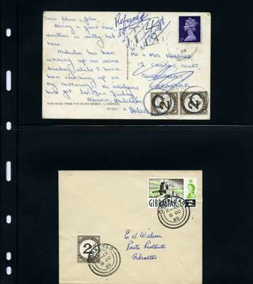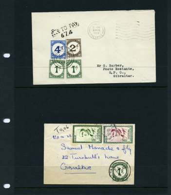 Postal History; Postage Due covers. 1940-1985 covers including 13 (one a front from Fiji) with Gibraltar adhesives, five philatelic; and hand struck marks with 1d, 2, 3d, 4d (two; one censored from Morocco, the other 'Presumed to contain coins' and compulsorily registered), 5d, 8d and 10d (the latter from India in 1941 with PRISONER OF WAR CAMP NO. 3 cancels). A very interesting group from a really difficult collecting area