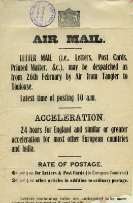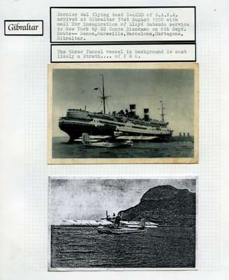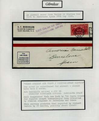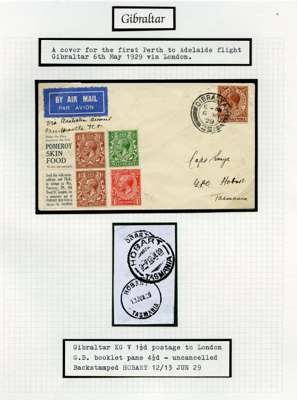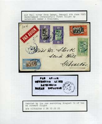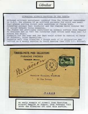 Airmails. Small but interesting group of items with three 1922 leaflets publicising the availability of Airmail services - "Passengers should provide themselves with warm clothes (fur coats and hats) and goggles"; 1923 Morocco to Paris cover; 1925 Dakar to Gibraltar cover from Dakar to Toulouse first flight; 1928 US to Barcelona (Roessler) cover for carriage on "First Italian Trans-Mediterranean Service" with supporting correspondence; 1929 Capt. Smye cover to Hobart; unused ppc of Dornier Wal flying boat at Gibraltar (1930); 1931 pilot-signed cover from Gibraltar to Tangier (second flight), and somewhat tatty 1931 Airmail Postal Rates notice